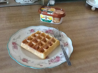 Breakfast this morning Belgium waffles with cinnamon sugar butter and no syrup!